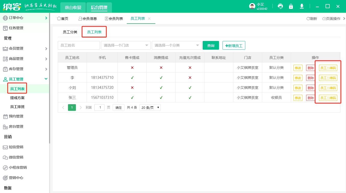 进入【后台管理】-【员工管理】-【员工列表】,点击员工分类,去新增员工分类,比如收银员、店长等等,然后点击员工列表,新增员工,添加员工基本信息,