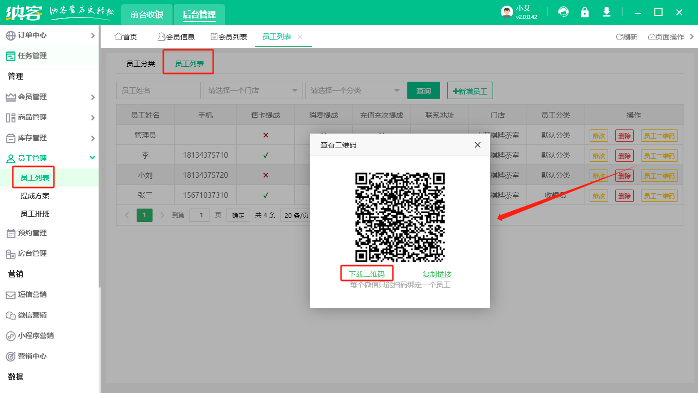 添加完成之后,在软件对接了微信公众号的情况下,可点击【员工二维码】,让对应员工扫描二维码查询自己的提成记录,如图: