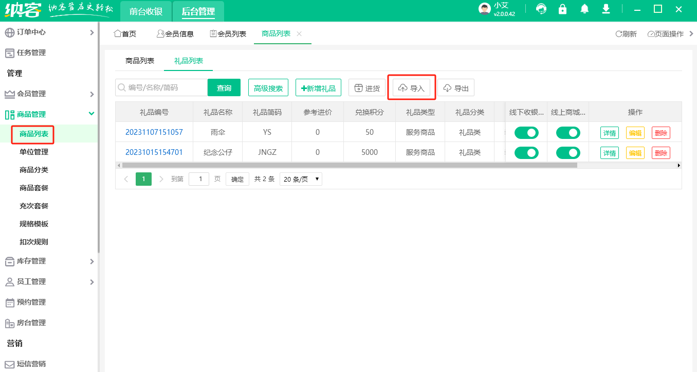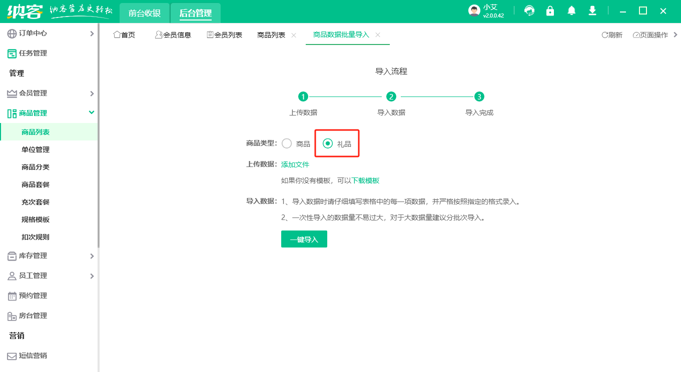 礼品很多的情况下,也可以操作批量导入礼品,那么和批量导入商品的步骤是一样的,可以参考操作。