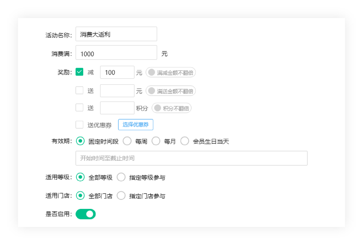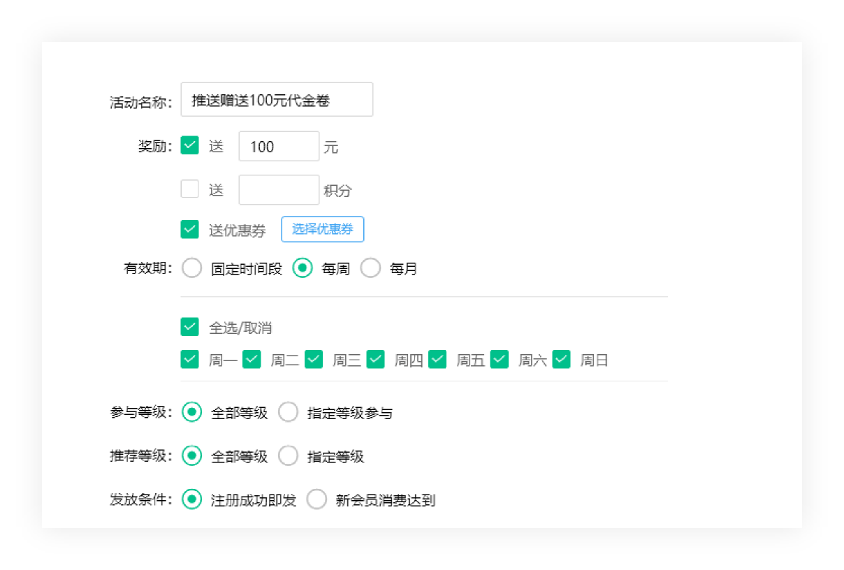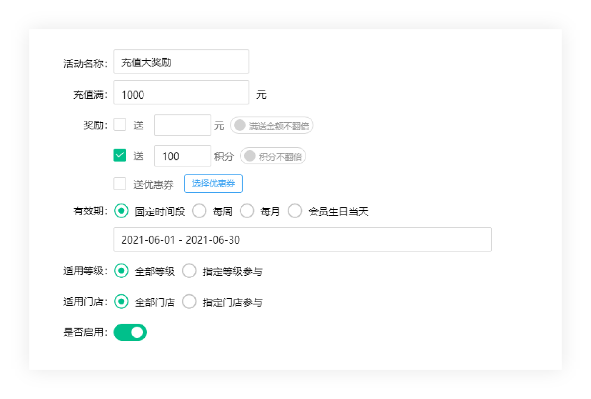 充值奖励活动,商家根据需求自行设定充值金额和奖励内容,奖励内容包括送金额/送积分和优惠券,其他设置内容根据情况自由设置。