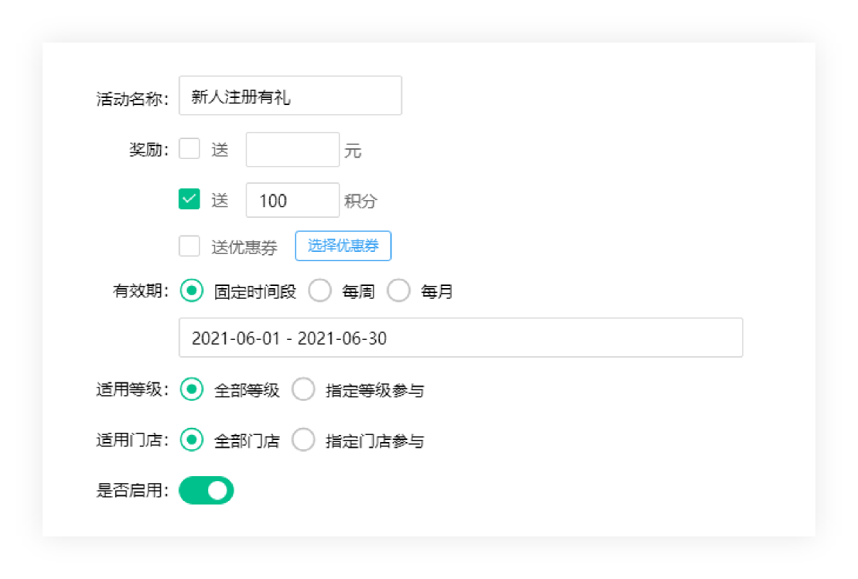 新人注册有礼,根据店铺情况对新注册的会员进行送金额/积分/优惠券的奖励,提高顾客的二次复购率,进一步提升门店的经营业绩。