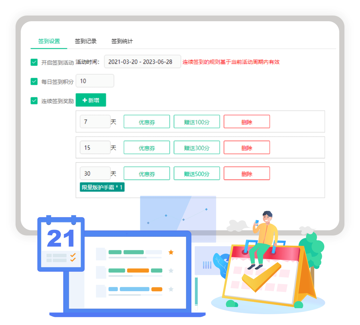 签到后台自行设置,包括开启签到活动时间/每日签到积分/连续签到奖励。同时还可以查看签到记录及签到统计,详细了解各个会员的签到情况。