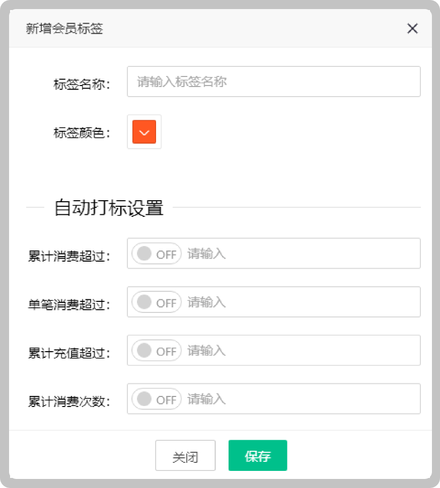 通过设置累计消费、单笔消费、累计充值、累计记次功能为会员打标,通过会员标签实现更加精准的会员营销