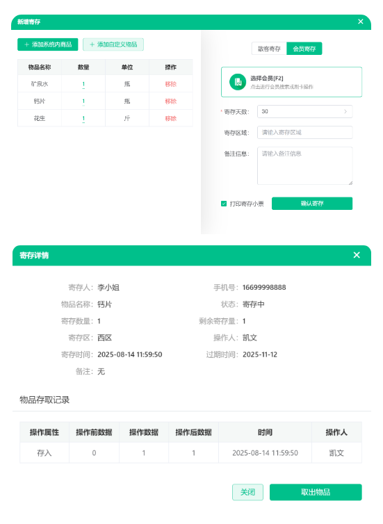 系统记录每笔寄存操作,支持物品分类管理(如普通商品、开封物品)。开封物品需一次性取走,避免遗失风险。
