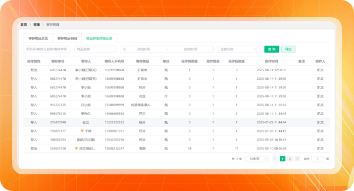 管理后台可查看寄存记录明细,包括寄存人信息、物品类型及存取时间等。这些数据为销售策略制定提供依据,例如预测热销商品补货周期。