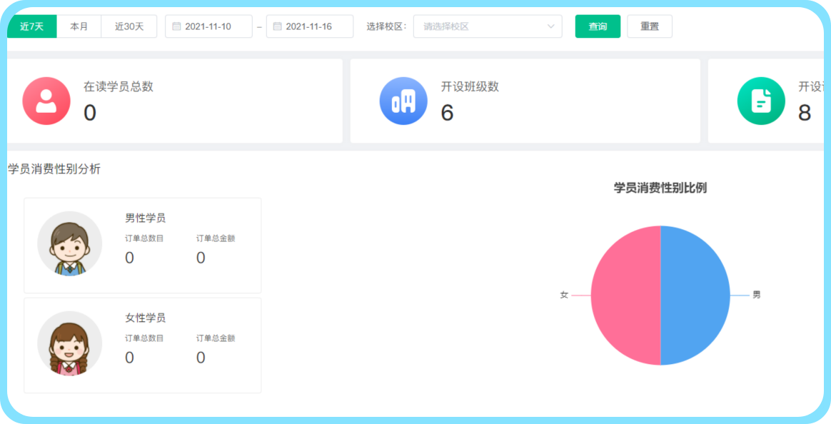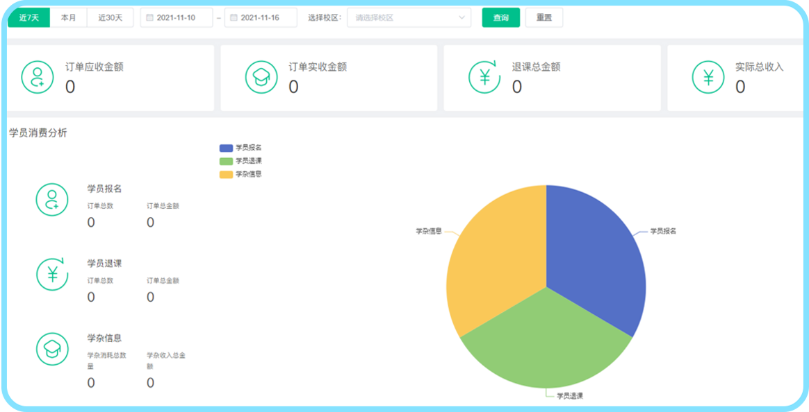 目前统计了课时相关明细记录、订单中不同款项分析、以及对学员和热门课程进行了统计分析