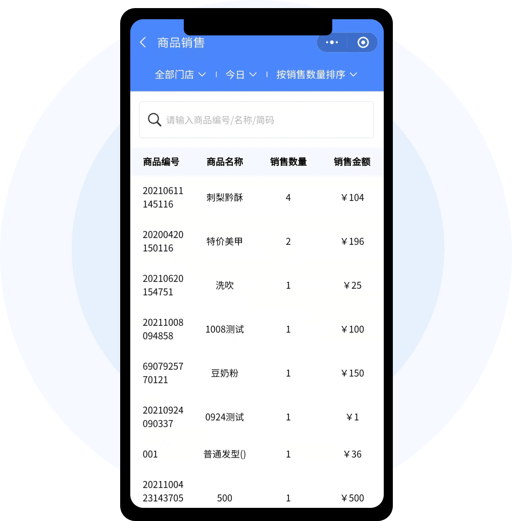 可分门店查询门店销售数据和商品热销数据。 商品热销是统计整体,不区分会员非会员,统计top20数据,默认近7天,还可切换30天和三个月的数据。