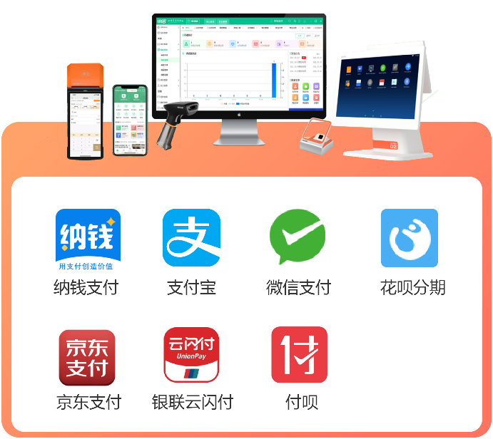系统支持PC/手机/收银机/pos机多端同步收银,支持纳钱