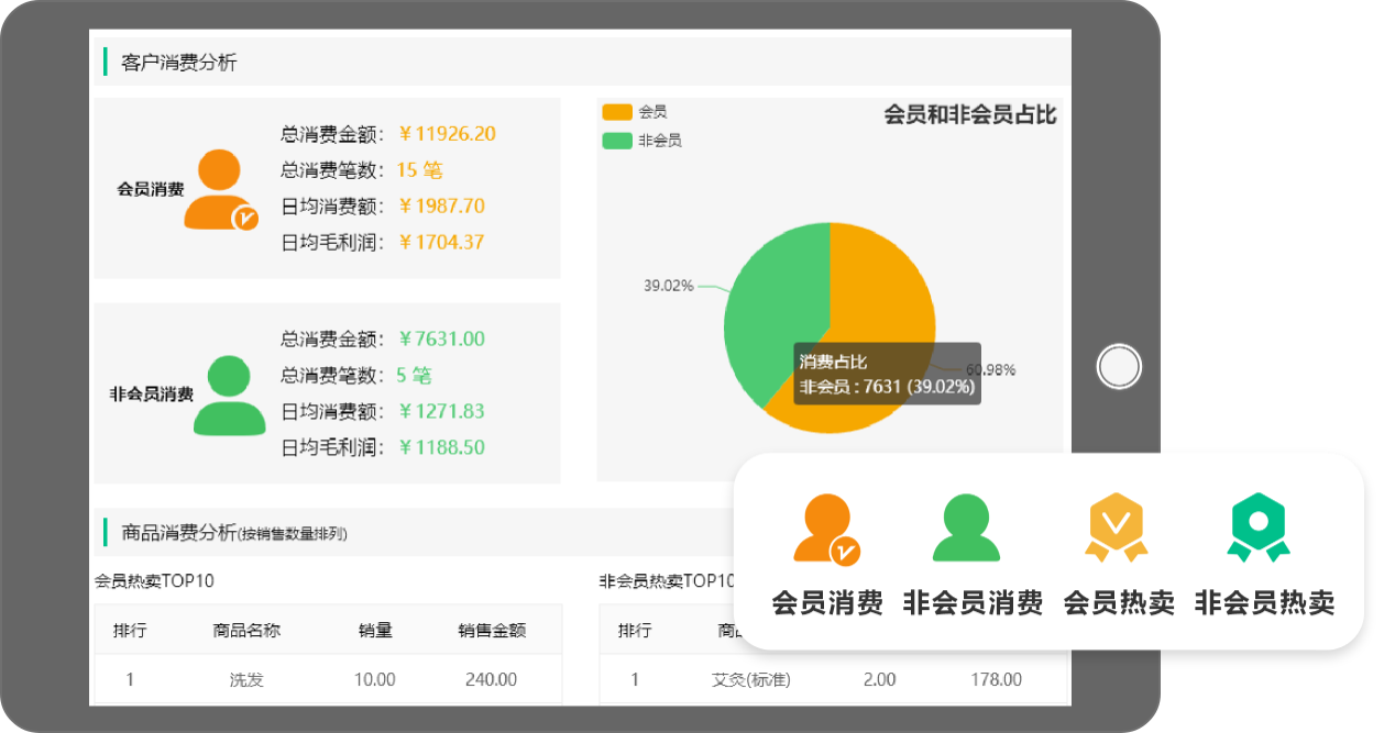 直观看到会员和非会员消费情况,以及会员和非会员热卖TOP10产品,从而可以看出会员营销的重要性后期加大对会员营销的投入