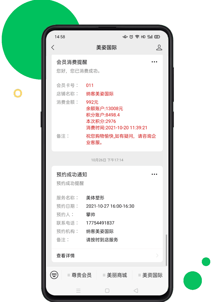 会员消费提醒和预约成功通知,都可以通过通过微信短信通知实时查看
