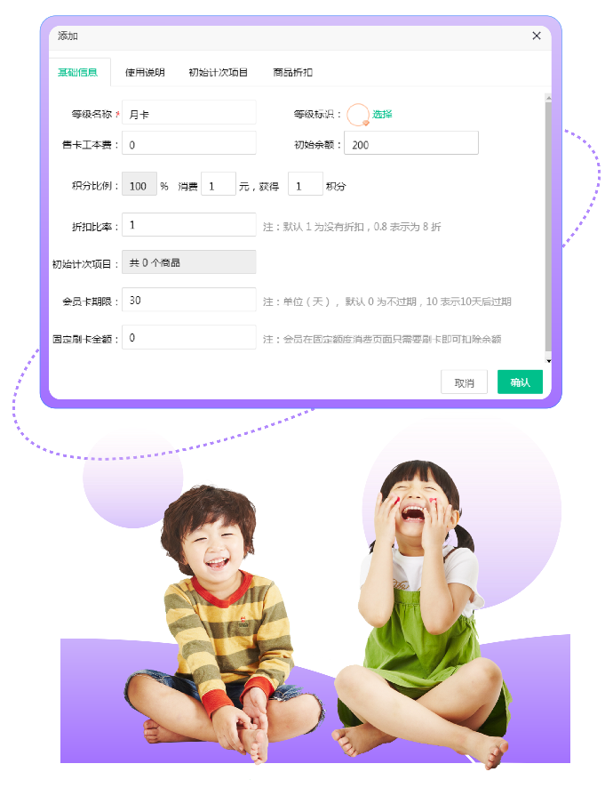 通过系统后台进行设置,可以为商家设定月卡季卡年卡套餐,