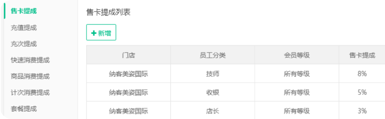 售卡提成/充值提成/充次提成/快速消费提成/商品消费提成/计次消费提成/套餐提成