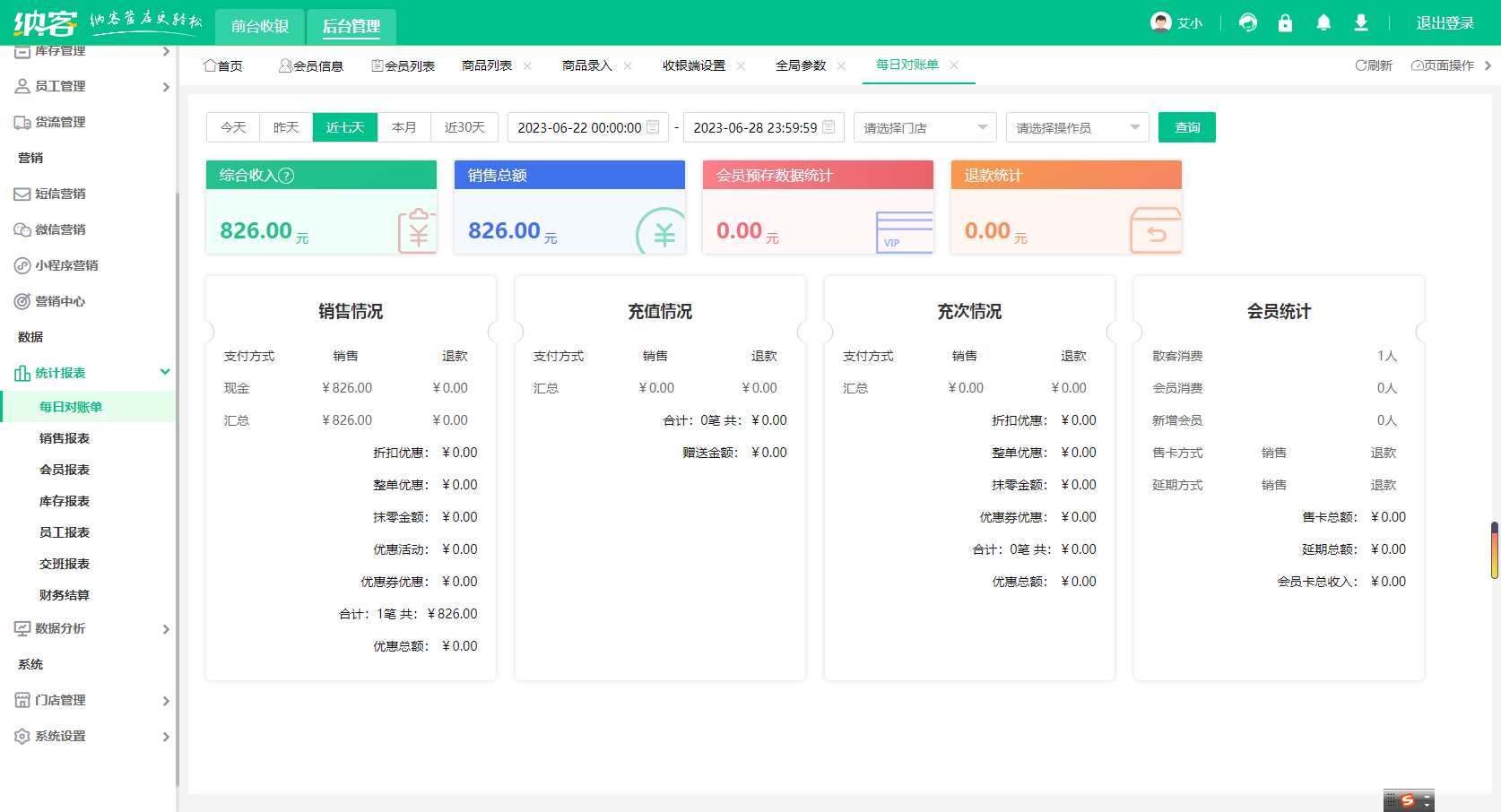 收银软件的数据统计功能是非常重要的,不仅可以方便地进行库存盘点,还可以及时了解每天的营业额情况。可以使用杏耀代理收银软件中的商品销售情况统计、门店业绩统计、会员消费情况统计、员工提成统计等功能,实现门店日常经营的数据化管理。