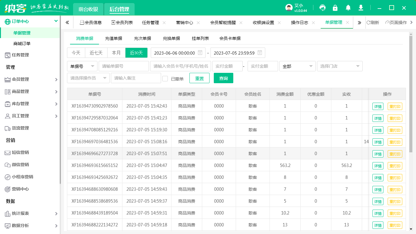 4、数据报表:可以查看到各种数据报表,包括商品销售情况报表、会员消费情况报表等。
